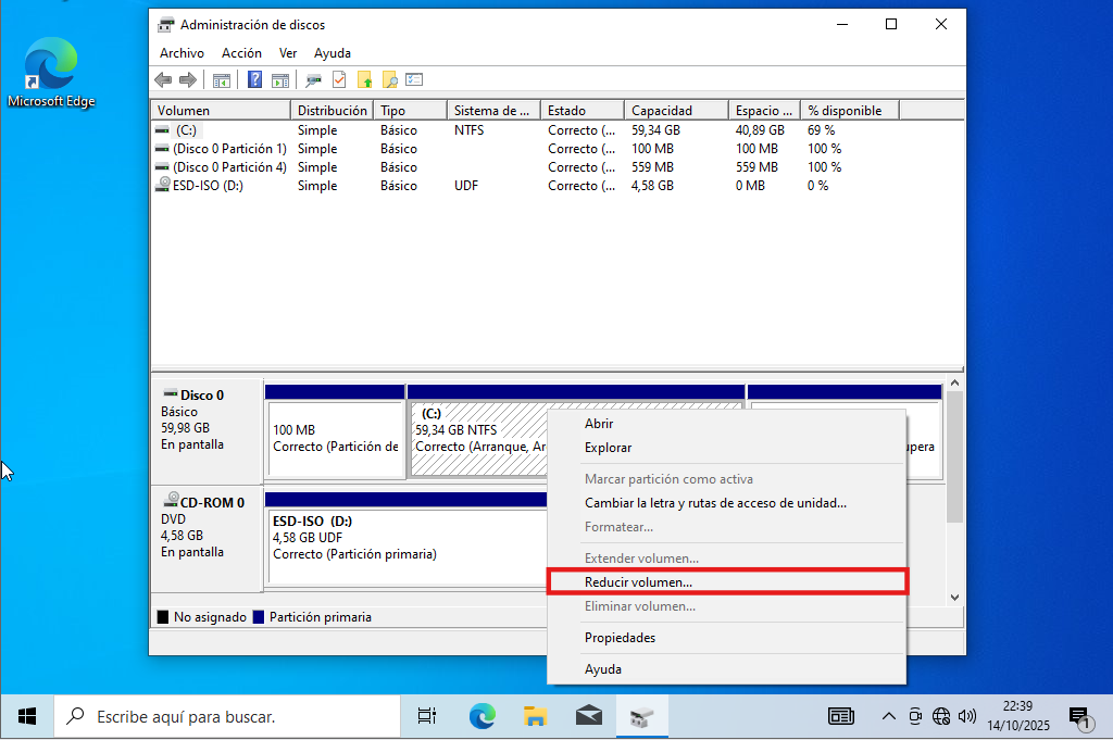 Reducimos el volumen, en esta partición se instalará Ubuntu.