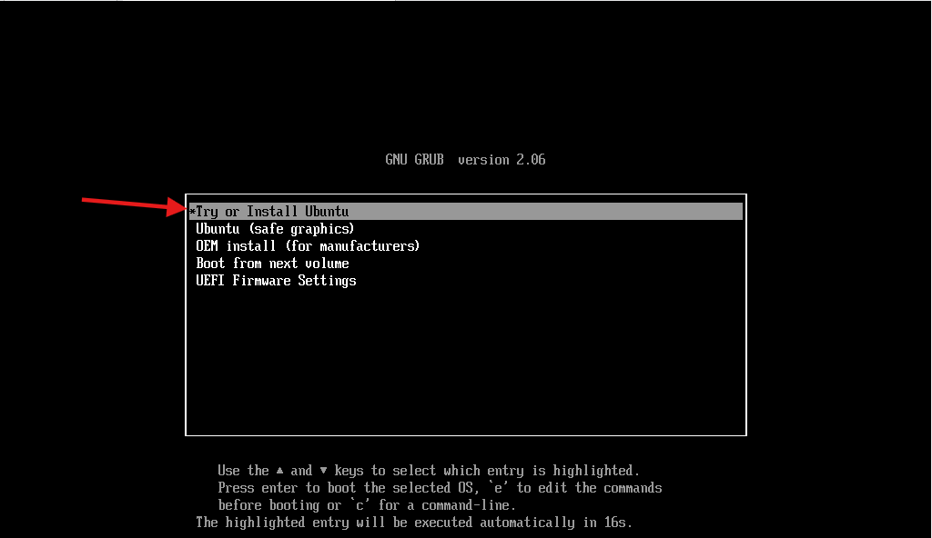 Para hacer esto tendrás que acceder al menú de inicio de tu ordenador y seleccionar el USB como unidad de arranque. Acceder al menú de inicio y cambiar la unidad de arranque depende del fabricante y modelo de tu ordenador, pero normalmente puedes hacerlo pulsando una tecla específica durante el arranque, como F12, F10 o Esc. Una vez dentro del USB de arranque seleccionaremos la iso, en este caso Ubuntu.