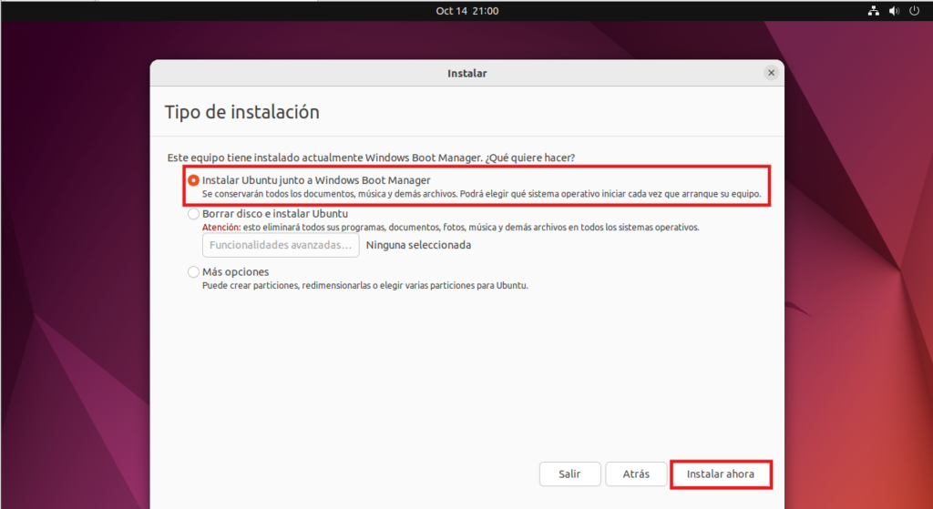 Una vez en Ubuntu personalizamos las opciones. En el tipo de instalación seleccionamos instalar junto a Boot Manager: