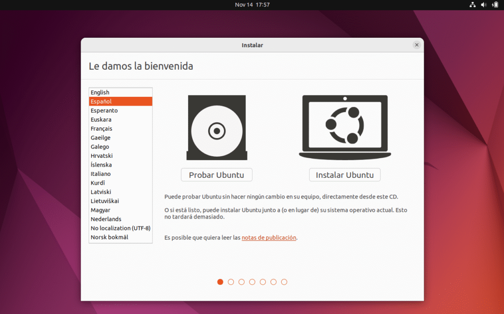 Elegir entre Probar Ubuntu o Instalar Ubuntu