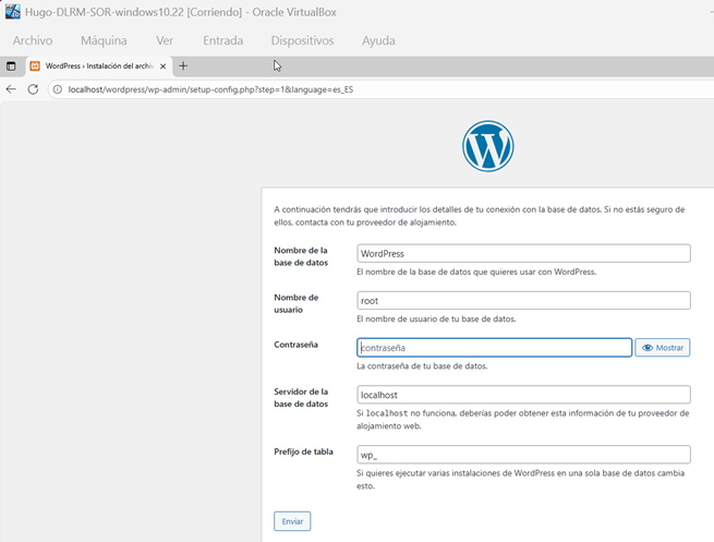 El asistente de instalación te pedirá los datos de conexión con la base de datos creada anteriormente.